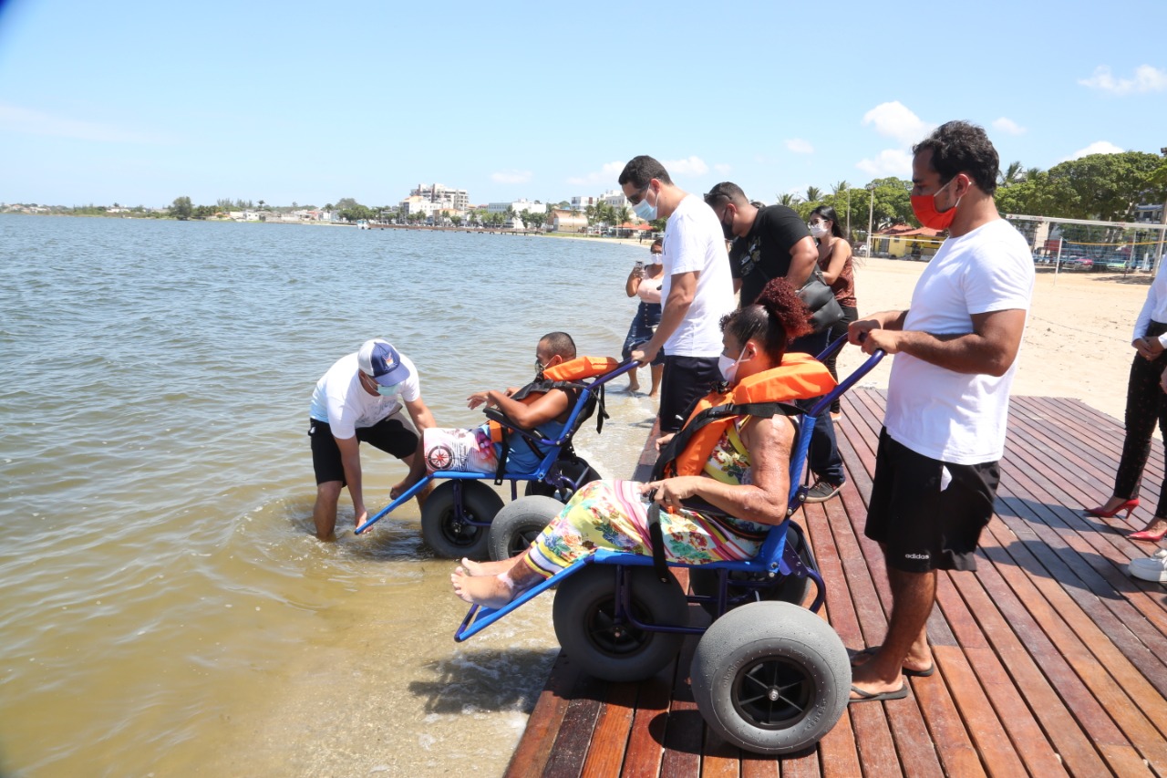 Ao final da cerimônia, dois cadeirantes estrearam os equipamentos. Eles puderam comprovar as facilidades de locomoção e tomaram um refrescante banho na Lagoa de Araruama.