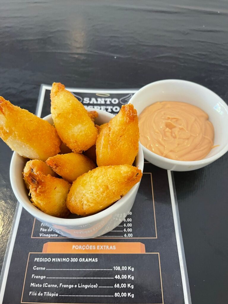 Comida de verdade, leve e saborosa, servida com fartura. Parafraseando Edilene Porto, a proprietária do estabelecimento: “no Santo Espetto tudo é feito com doses generosas de amor e capricho”. O cardápio reúne petiscos variados como: bolinho de feijoada, camarão empanado, pastel tradicional com massa da casa, pastel de angu com carne seca, entre outros. Além, é claro, pra fazer jus ao nome, o “espeto” Churrasquinho Gigante, que na verdade veem no prato, bem servido, com 250 gramas em tiras de carne, acompanhado com arroz, farofa e vinagrete. O feijão tropeiro e a farofa também são marcas registradas da casa.
