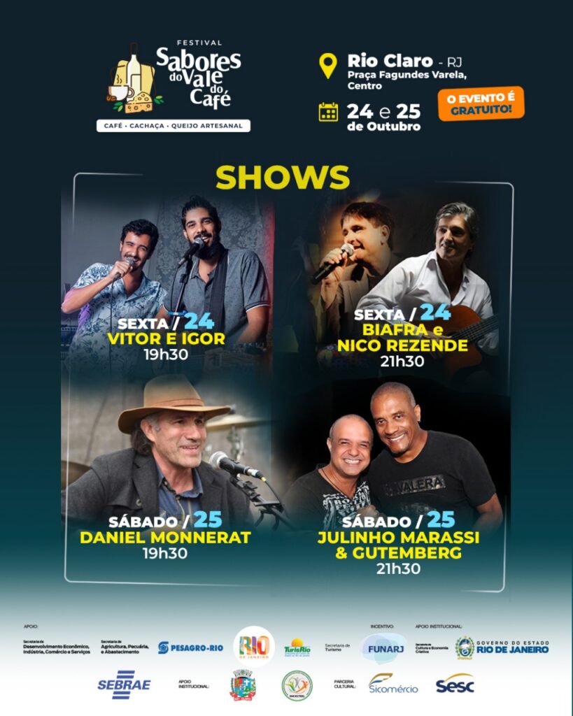 Entre os dias 24 e 25 de outubro, Rio Claro vai receber uma edição especial do Festival Sabores do Vale do Café. O evento, que já passou por Vassouras, Pinheiral, Rio das Flores, Conservatória e Ipiabas, celebra os cafés especiais, os queijos artesanais e as cachaças premiadas produzidas na região pelos componentes do APL do Vale do Café.
