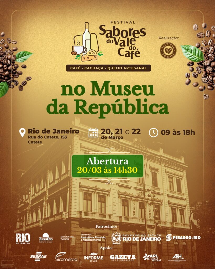O histórico Museu da República será palco de uma edição especial do Festival Sabores do Café entre os dias 20 e 22 de março. Com entrada gratuita, o evento acontece das 9h às 18h e promete levar à capital fluminense a qualidade e a diversidade da produção agrícola do interior do estado.